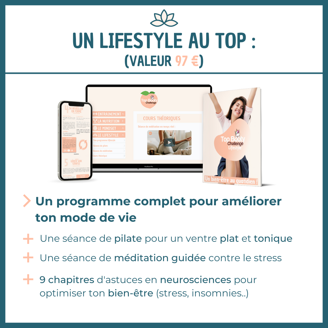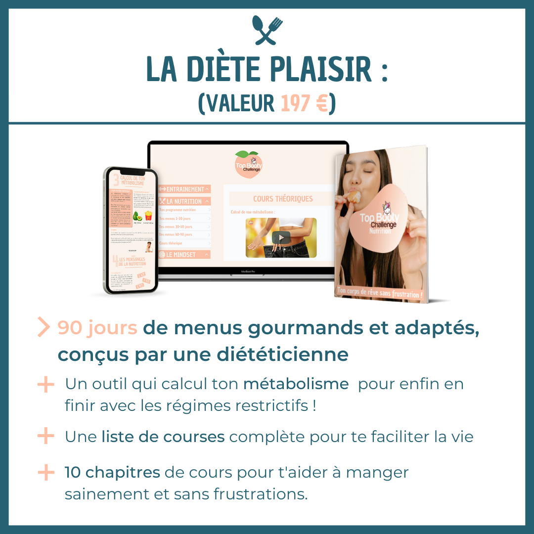 La différence avec ce programme est qu'en plus d'avoir une transformation physique, tu vas apprendre à avoir une relation saine avec la nourriture, à te régaler, kiffer tes séances et enfin trouver un réel équilibre.